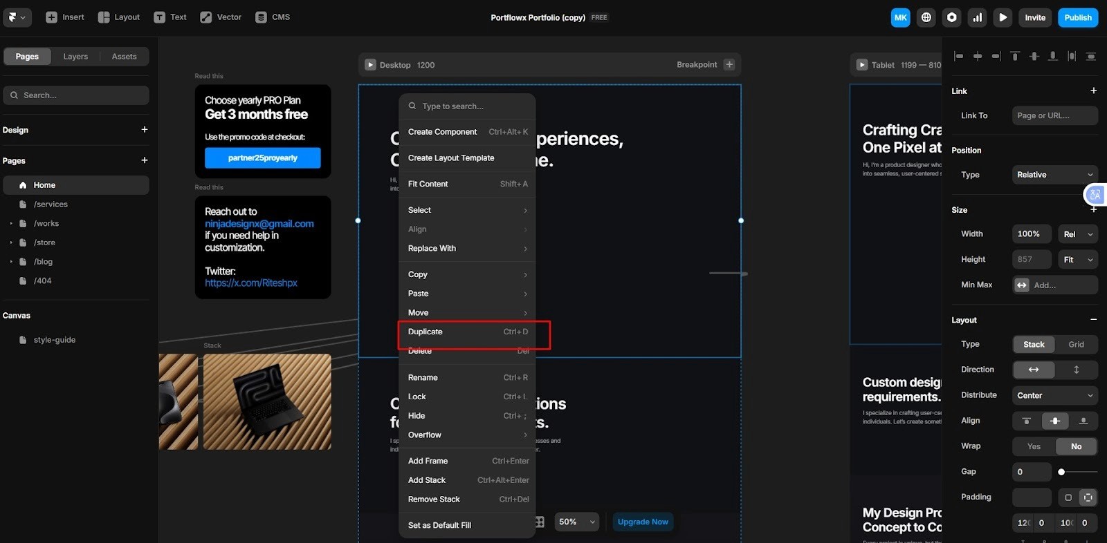 Click Add Page to create a brand-new blank page or, to reuse layout and components, right-click an existing page and select Duplicate copies sections, components, and layout great for service/portfolio pages that share structure.