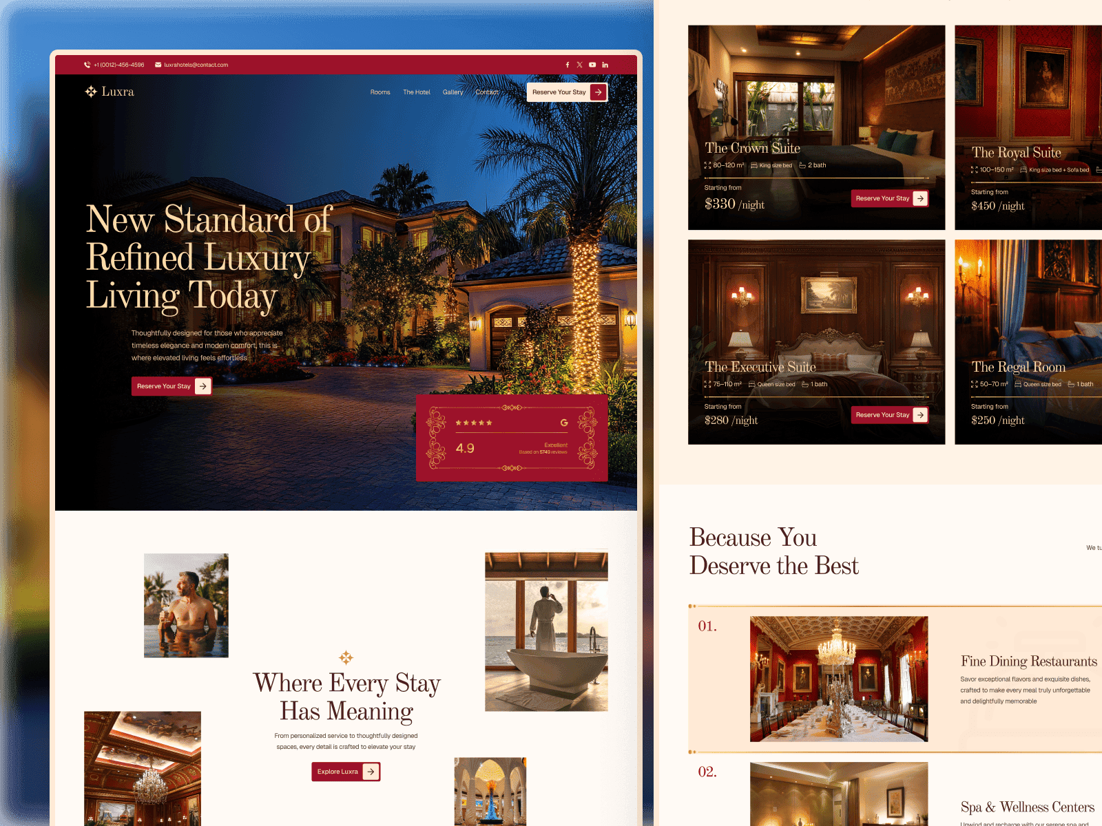 Luxra comes with everything a high-end hotel website needs. Show your suites in style. Let guests book rooms easily. Display your spa, restaurant, and special offers. The template works perfectly on phones, tablets, and computers.